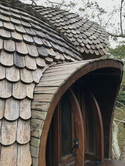 進了小門,是用網室作成的甜甜圈空間,左側的路上擺了三顆巨石,好奇心又來了,巨石間剛好可縮小腹通行一人,通過後是一個巨型拉門,再次提起勇氣打開,看見一抹天光,眼睛習慣了強光後,眼前是幾個顆長在巨石間的小樹,目光再放遠點,是森林間的小湖泊,美。